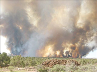 Full fire with black smoke in wooded areas during Long Mesa Fire at Mesa Verde National Park, July 29-Aug. 4, 2002