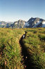 A deep trail with a water bottle on it through a grassy meadow. In the distance are mountain peaks.
