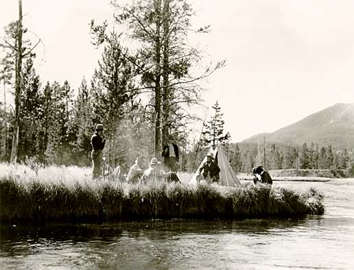 1957 re-enactment of the Washburn, Langford, Doane Party -- Expedition of 1870 -- In Camp at the junction of the Firehole and Gibbon Rivers (Madison Junction) which gave birth to the National Park Idea . Yellowstone National Park.