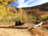 A campsite at Echo Park shows a campfire grate surrounded by logs for sitting.