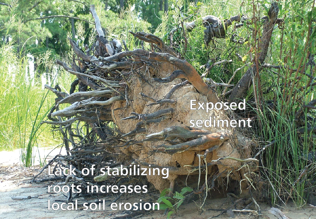 Jamestown Island. Storm winds blew this tree down, exposing its rootball to weathering. Sediment weathered from the