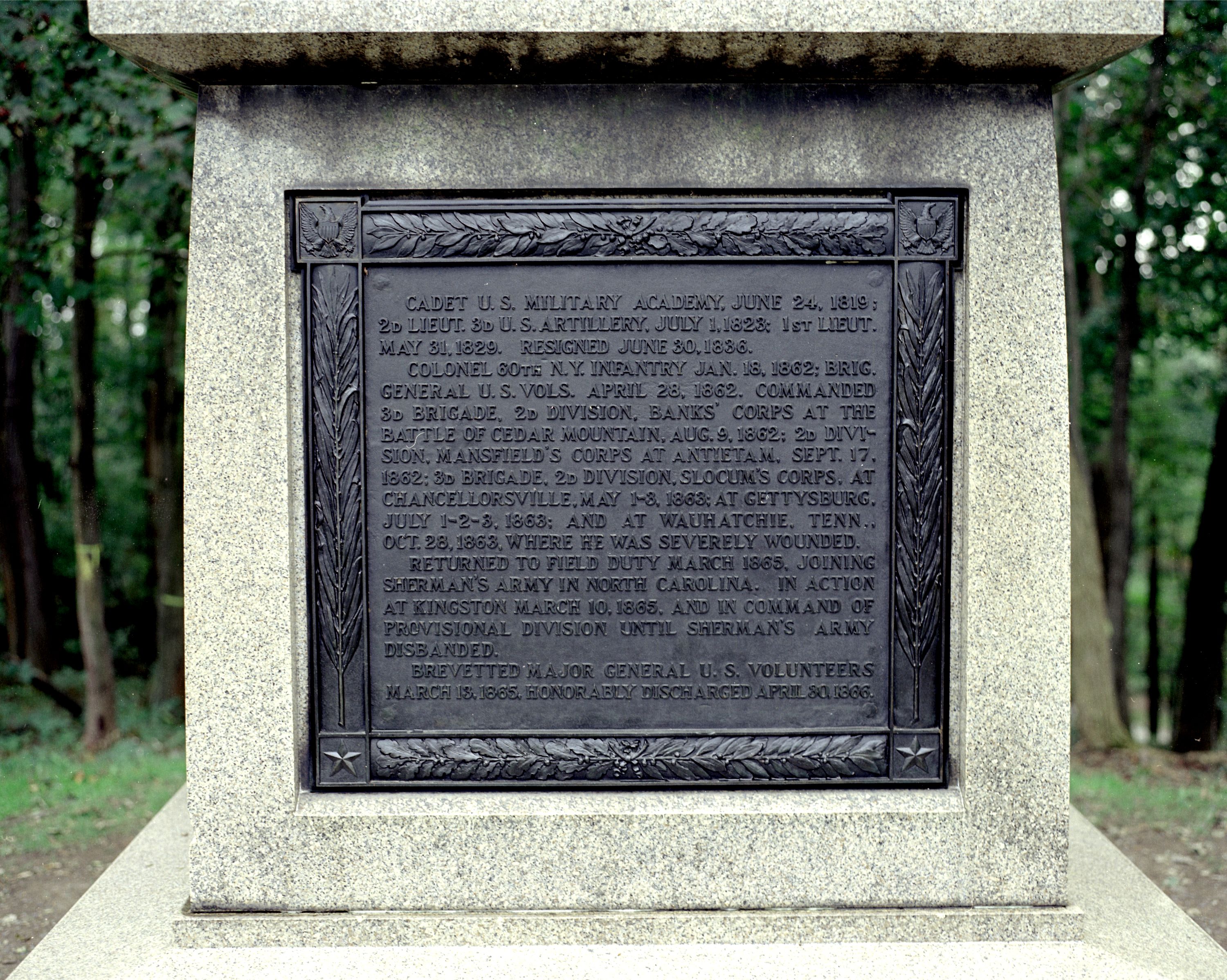1 of 15 statue monuments in park. Indicates extreme left position held by Greene's line July 2 & 3, 1863. Located summit of Culp's Hill. || Mn base 9'sq rough-cut, tooled-edge. 2 part shaft, 2nd part polished granite w/ set bronze tablets front & rear, bronze star W side, bronze state medallion E side, topped w/ ramparted stone work. Apex Brig. Gen. Greene pointing. All 16'2-1/2" H.