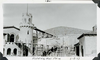 Detail of forms in place for retaining wall between Scotty’s Castle Annex and Gas House. March 8, 1929. Photographed by Mat Roy Thompson. Annex on left with construction ramps leading to Flag Tower and Upper Music Room. Man working with wheelbarrow contents on Upper Music Room ramp. Another man below working with lumber. Third man at top of retaining wall. Gas House on the right. Inscription in black ink, center of bottom margin: Retaining Wall Forms. In black ink, lower right: 3-8-29. Number in black ink in center of top margin refers to historic photograph numbering system: 1861. Black and white, horizontal format, 3 x 5 inch. Corner mounted and adhered on photograph album page.