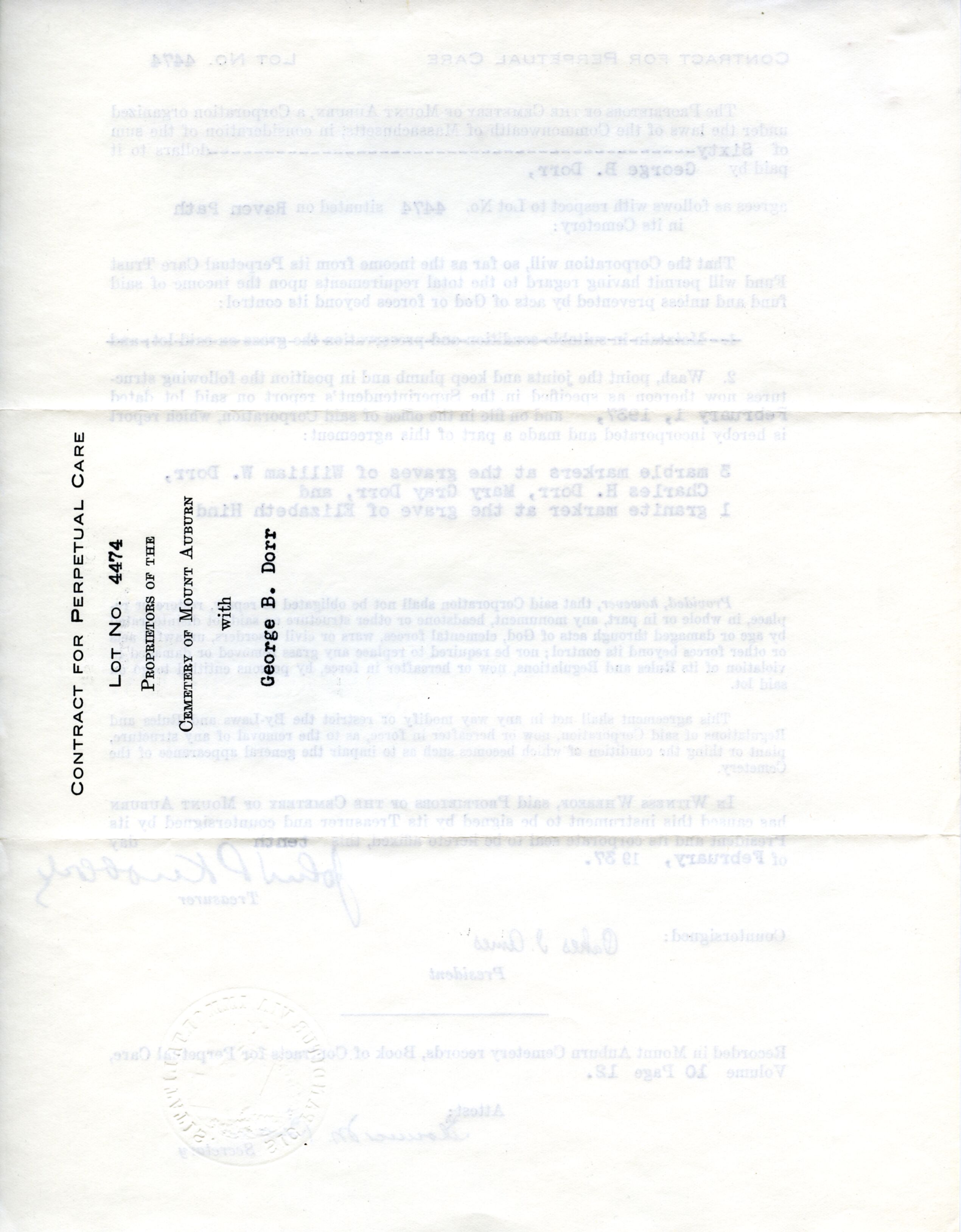 Back of contract for the increased Perpetual Care maintenance and care of the Dorr Family cemetery lot at Mount Auburn Cemetery to include maintaining the grave markers. Signed by Mount Auburn president, treasurer, and secretary. See following entries for related material: "Letter, Peterson to Dorr, February 2, 1937.tif" and "Document, Mt. Auburn to Dorr, February 10, 1937 p. 1.tif"