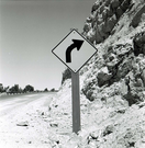 Left curve ahead road sign in Kolob Canyon. ; ZION Museum and Archives Image 007.01.01-38of73 ; ZION 15933