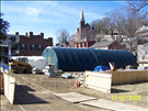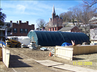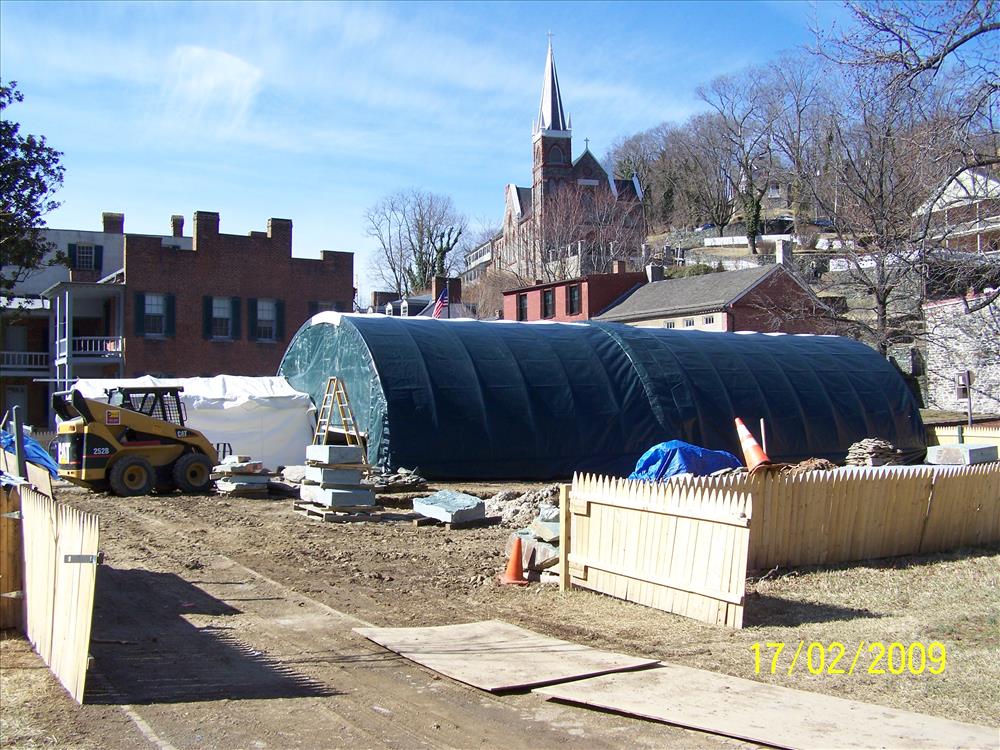 HPTC Day Labor Craftsmen laying stonework for the HAFE Park west arsenal foundation stabilization, Harpers Ferry Lower Town, February 17, 2009.