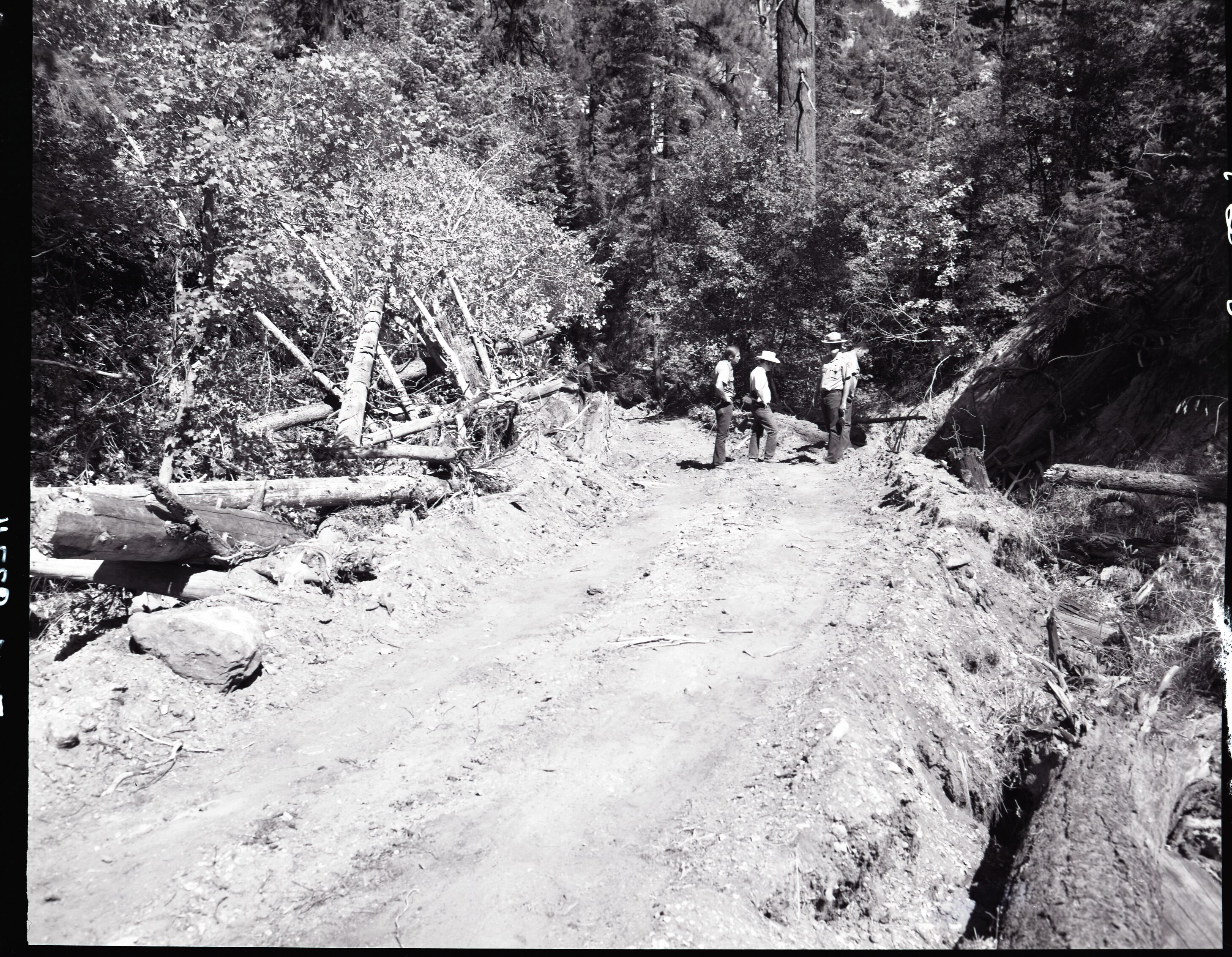 Dirt road from Potato Hollow to Kolob Creek bulldozer blade attempted to push fallen tree. ; ZION Museum and Archives Image 101_02_002 ; ZION 8289