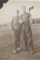 Two men gather around a liquor bottle. Handwritten label Me is next to the man on the right