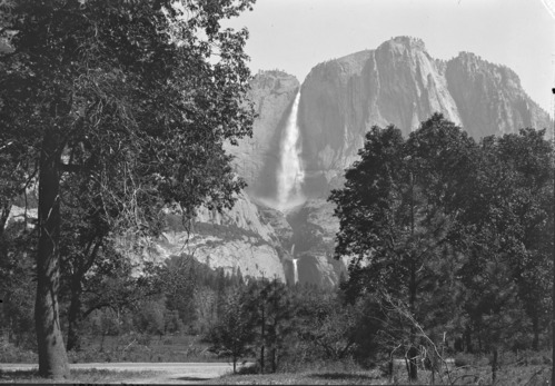 Upper Yosemite Fall from road side west of Chapel. Record demise of snow cone.