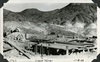 Scotty's Castle Chimes Tower foundation under construction. October 8, 1928. Photographed by Mat Roy Thompson. Looking northeast, concrete supplies at left. Inscription in black ink on lower left corner referring to historic photograph number system: 1763; in center: Clock Tower; date on right: 11-8-28. Black and white, 3x5 inch, horizontal format. Corner mounted in photograph album.