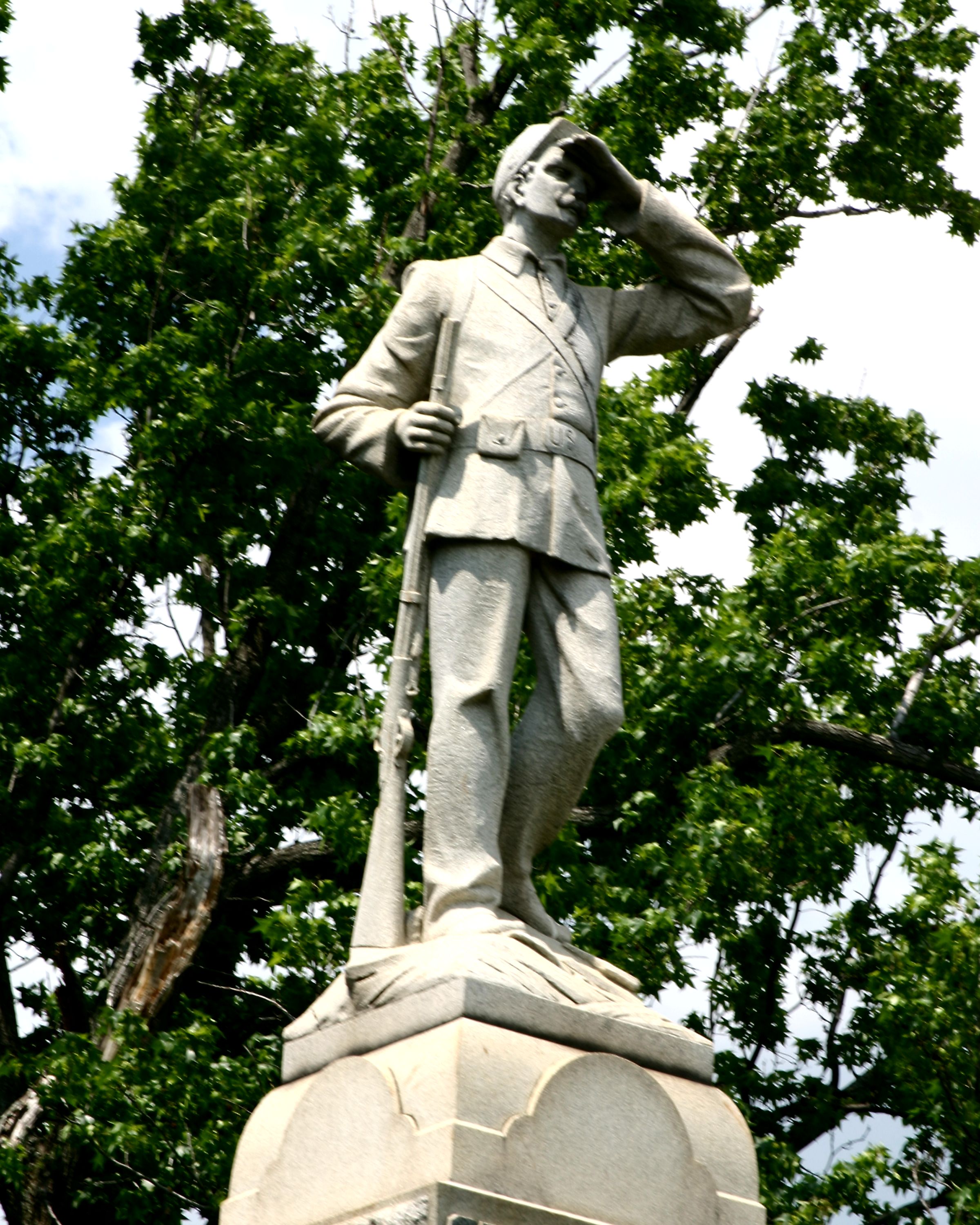 Erected to commemorate service of the 15th Reg. New Jersey Volunteer Infantry commanded by Col. Wm. H. Penrose. Troops were engaged for 2 hours at this line May 3,1863. Rededicated May 16, 1964 by NJ Gov. Richard Hughes. || Mn & marker. Mn: 30'H w/ square base having polished raised lettering & carved rifle relief, 10' polished column, & 3' crowning supporting 7' statue of soldier. Rough-cut dededication mrkr, 1'6"Hx1'8"Wx10", bears bronze plaque on polished face.