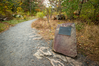 Photograph of plaque attached to the face of a large boulder in the foreground near a trail leading into a forest.