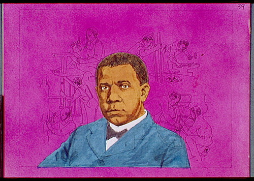 Portrait of Dr. Booker T. Washington superimposed over line illustrations of scenes of skilled crafts and trades, as well as, academics, professions, and sciences.