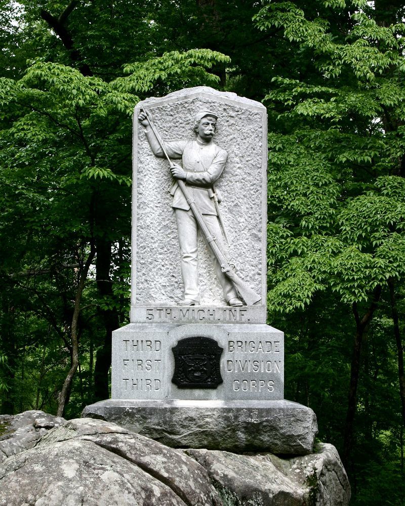1 of 9 mns in Park honoring Michigan soldiers at Gettsyburg. Marks position held by regiment about 4:30 pm on July 2, 1863. Located on N side of Sickles Ave near Loop and Wheatfield. || Rough-hewn base, 6'3"x4'11", hammered & smooth shaft, 4'x2'7", 10'6" high. Sculpted relief of infantryman loading his musket & bronze State seal aborns S side and historical inscription incised on N side. Set on native boulder.