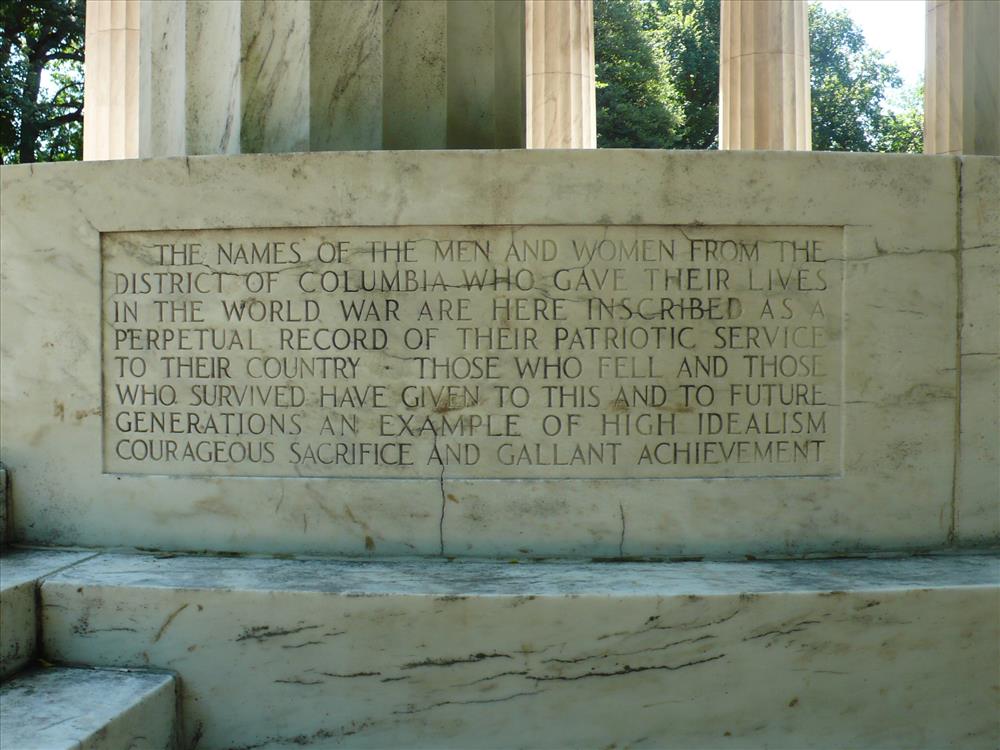 The names of the men and women from the District of Columbia who gave their lives in the World War are here inscribed as a perpetual record of their patriotic service to their country. Those who fell and those who survived have given to this and to the future generations an example of high idealism, courageous sacrifice, and gallant achievement.