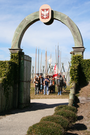 Visitors and reenactors in costume carry pikes to the fort gate