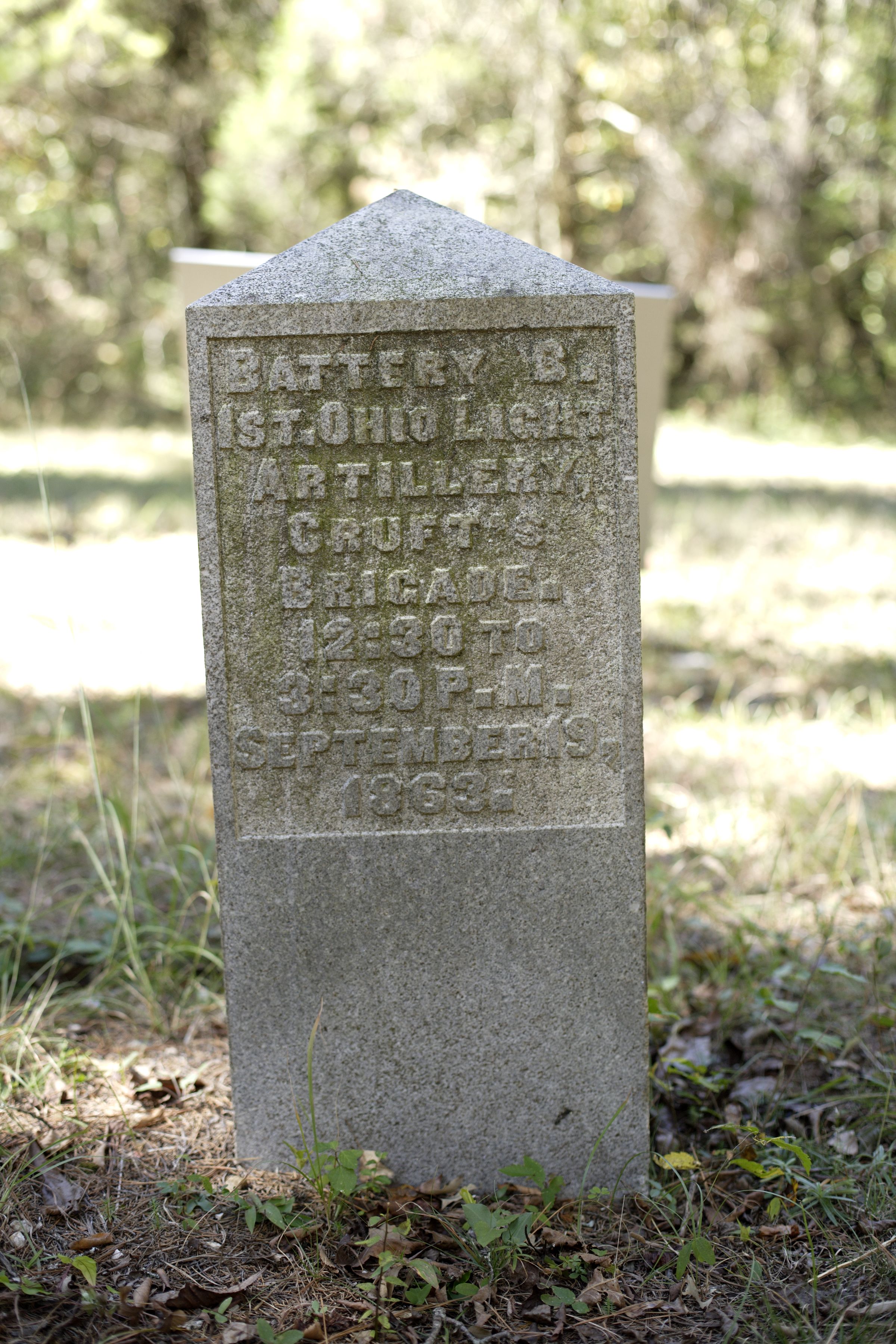 Marker contributes to nat'l significance of park under NR Criterion A because it represents the national movement among veterans & related groups to commemorate Civil War battlefields. || A 1'6" x 1'6" x 3' high granite obelisk with a raised letter inscription. Marks unit's position west of Brock Field on September 19, 1863, from 12:30 to 3:30 p.m.