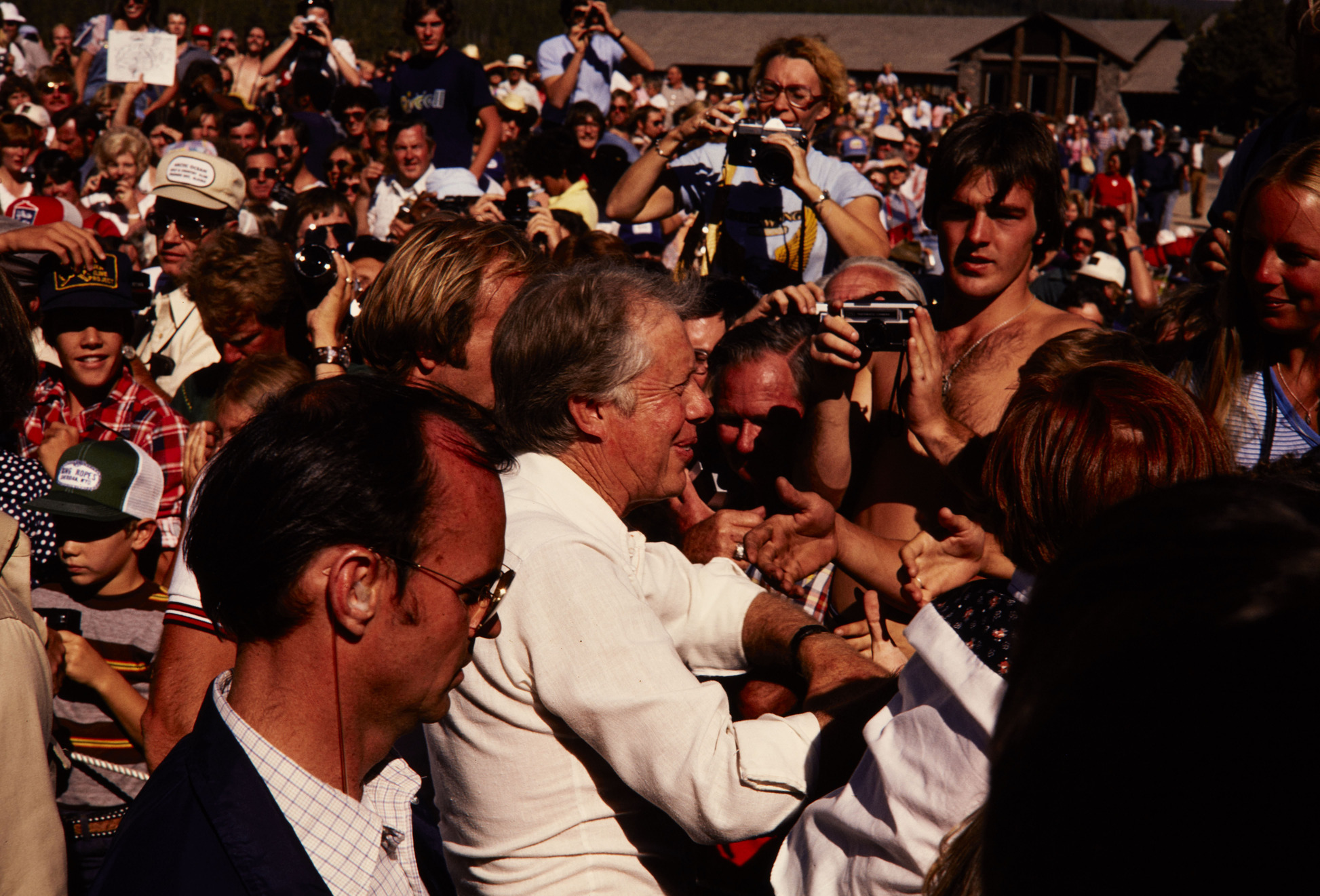 Presidential Visits. President Jimmy carter shaking hands in a crowd at Yellowstone National Park in Wyoming.