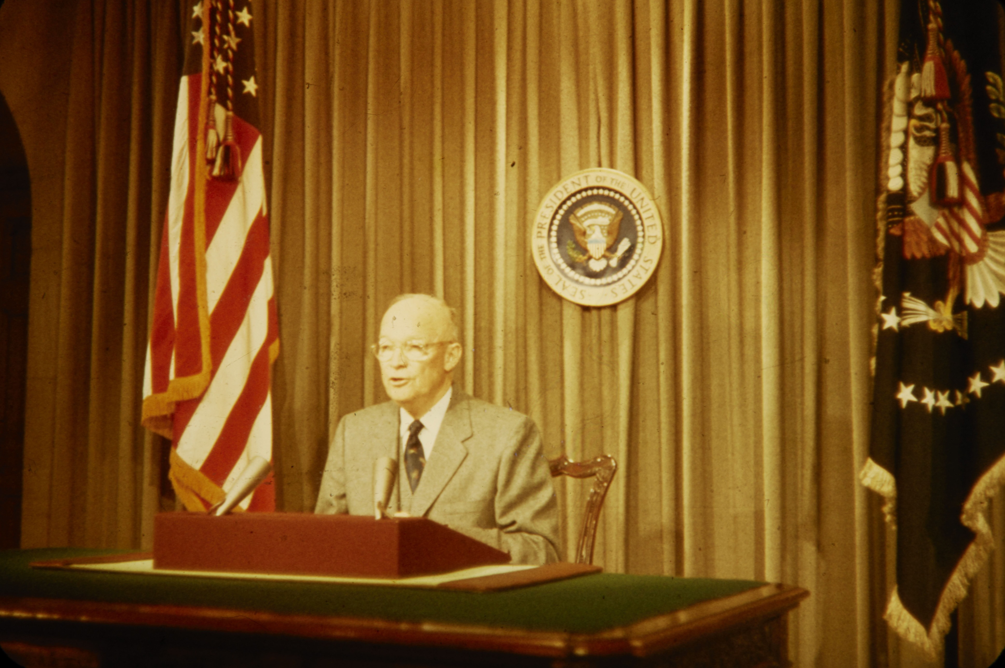 Dwight D. Eisenhower talking behind a desk with the presidental seal behind him.