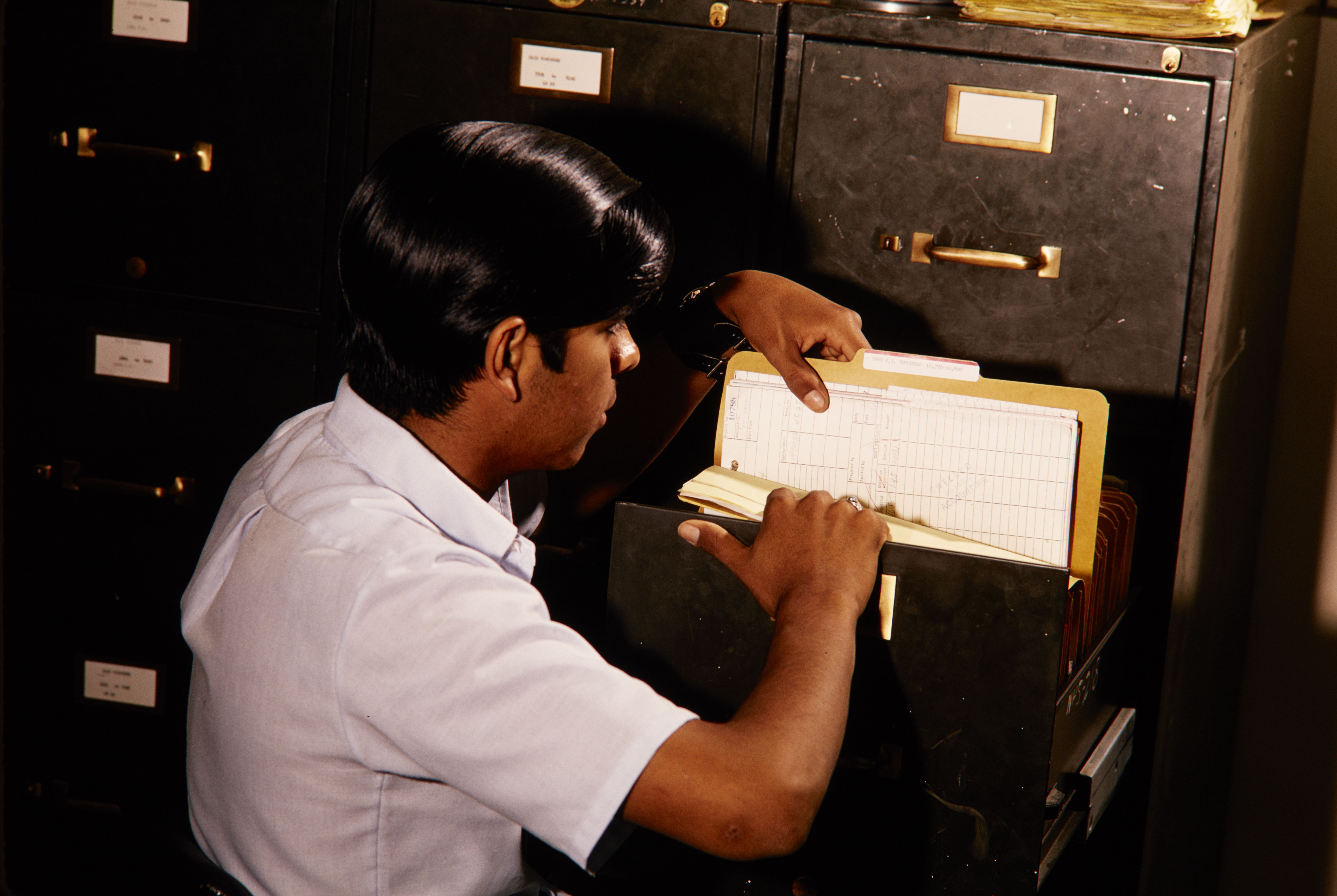 Lawrence Cata reorganizing voucher files in the southwest regional office. Image Number 69-436-6.