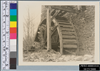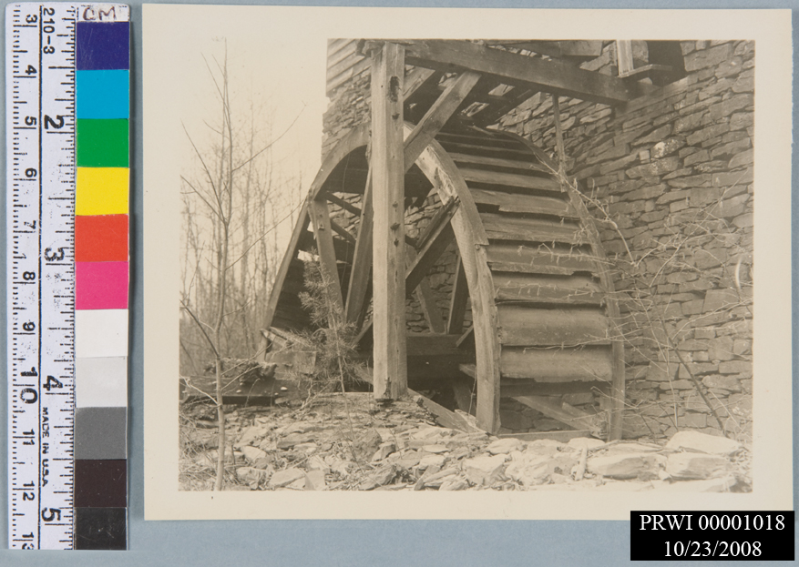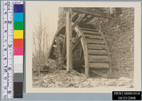BLACK AND WHITE<CRFOREGROUND:STONE WALL WITH FRAME SUPPORTING WOOD WHEEL<CRBACKGROUND:SMALL LEAFLESS DECIDUOUS TREES<CR"18"PENCILED ON BACK<CRYELLOWED, GLUE STAINS ON BACK