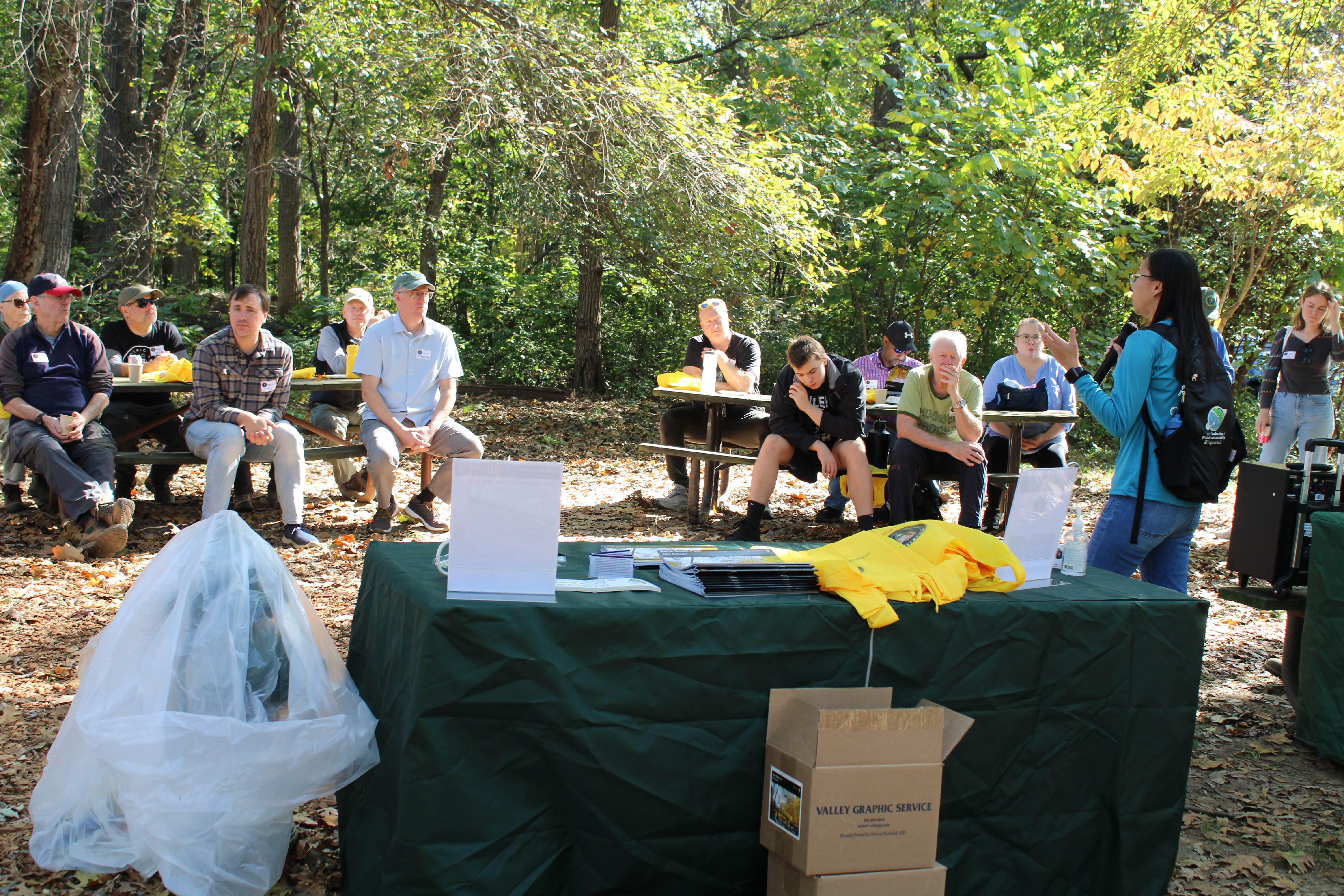 A group of volunteers are seated at two picnic tables and listen to a woman speaking in front of them.