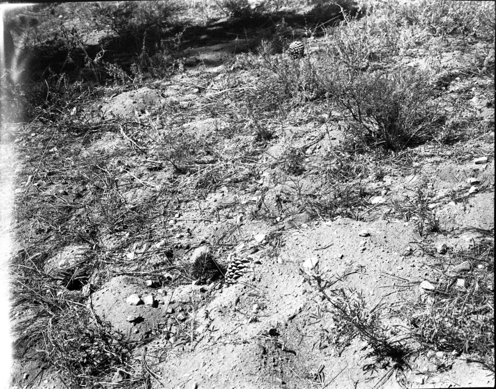 Lowell Sumner, 470916, Chagoopa Plateau, SNP, Meadow Studies, pinecone half buried in the loose, overgrazed and trampled granite soil. This is how forest land invades meadows. Field notebook pg 1122.