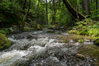 Fast water and mossy rocks from the middle of a brook. Trees are on all sides.