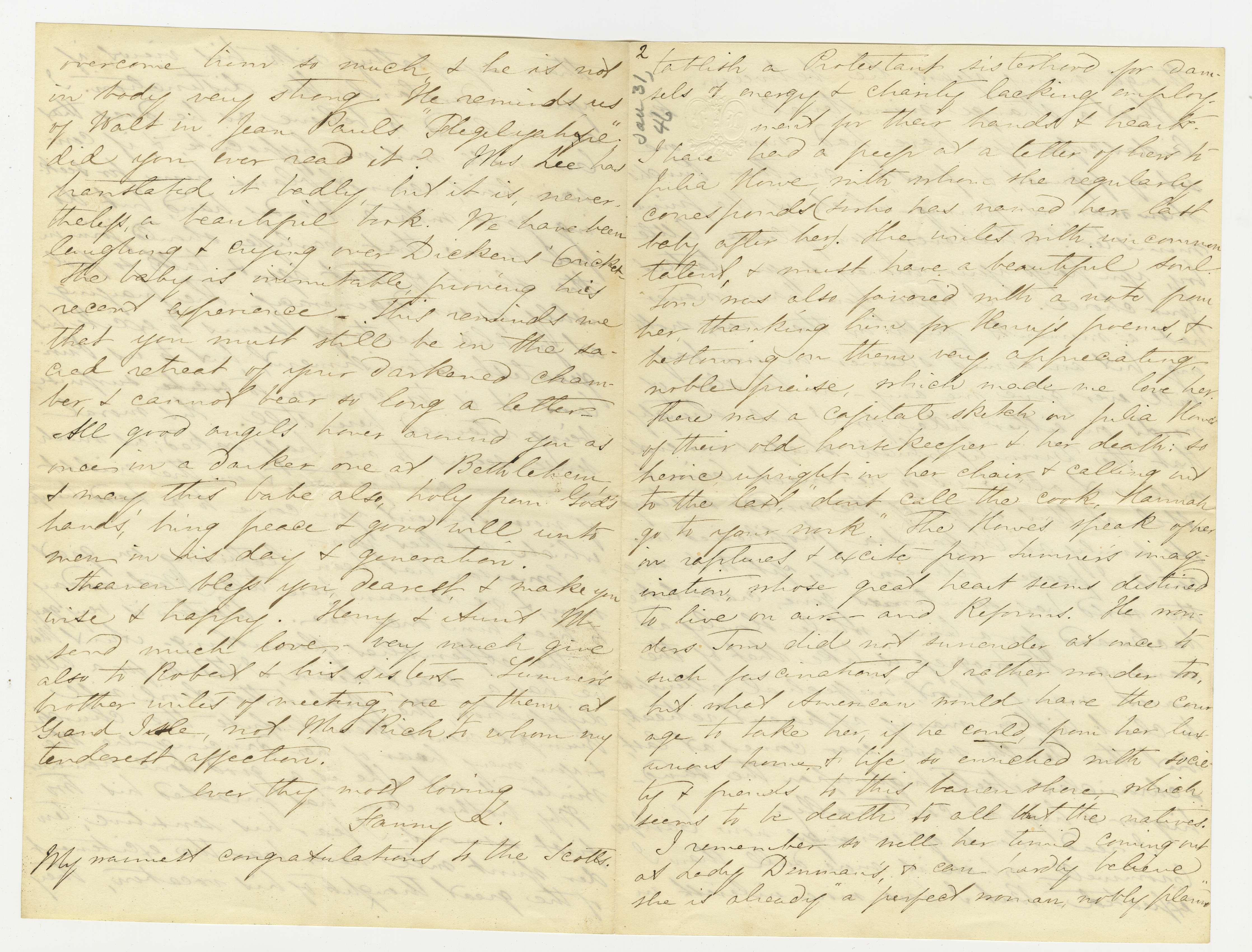 My brother Sam has preached his two first sermons. I fear his sensitive, tender spirit will never bear the excitement of the great thoughts of his vocation, they [p. 8] overcome him so much, & he is not in body very strong. He reminds us of Walt in Jean Pauls “Flegeljah[crossed out: y]re”. did you ever read it? Mrs Lee has translated it badly, but it is, nevertheless, a beautiful book. We have been laughing & crying over Dickens’ Cricket – The baby is inimitable, proving his recent experience. This reminds me that you must still be in the sacred retreat of your darkened chamber, & cannot bear of so long a letter – All good angels hover around you as one in a darker one at Bethlehem, & may this babe also, holy from God’s hands,’ bring peace & good will unto men in his day & generation.