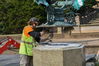 A conservator inserts the large screws that will be used to hold the armillary sphere in place