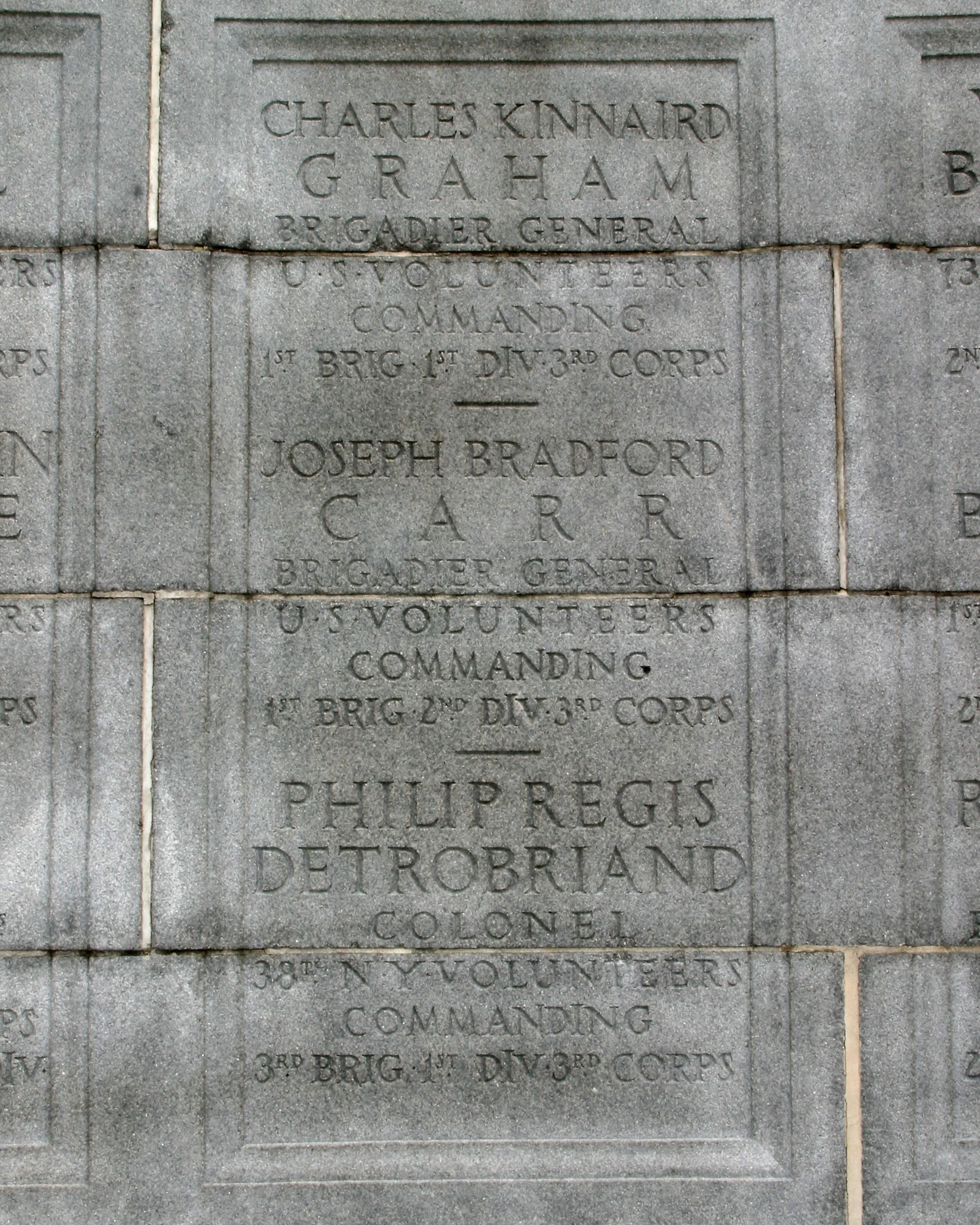 1 of 2 New York State Monuments. Erected to commerate NY commanders not listed elsewhere that fought at Gettysburg. Located E side South Hancock Avenue. || Mn, semi-circular 42'L x 24'D x 21' H. Central projecting node of base, shaft incised inscriptions, excised coat-of-arms, topped by spread wing eagle. Incised commander names in circular wall portions. Granite walk to Mn 8'x 14'w/2risers 8."