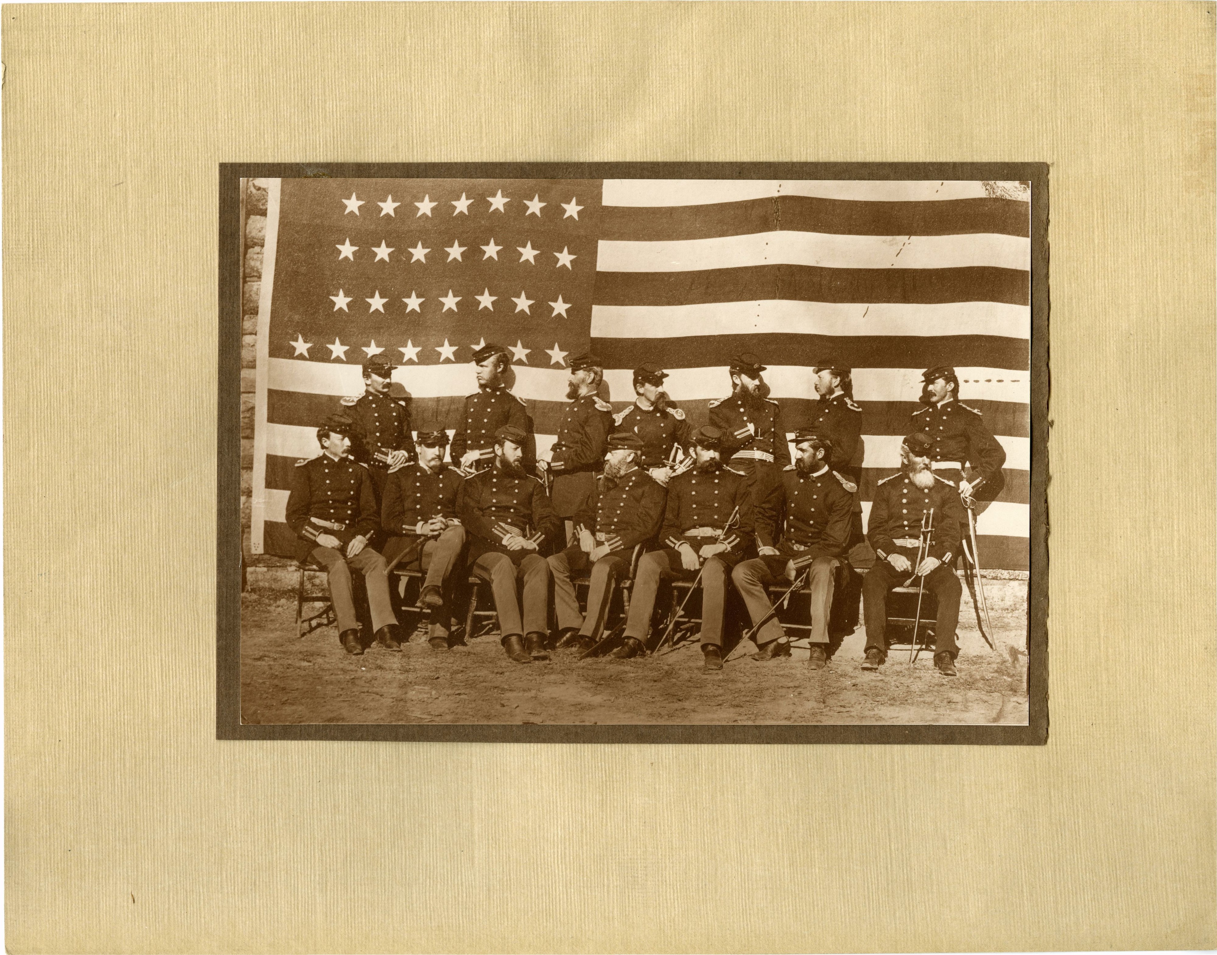 LIBI_00312_11299; ONE PRINT MOUNTED OF 14 OFFICERS IN DRESS UNIFORM. SEVEN ARE SEATED AND SEVEN ARE STANDING. THEY ARE POSITIONED IN FRONT OF A LARGE U. S. FLAG WHICH IS HANGING ON THE SIDE OF A LOG BUILDING.; Print;Courtesy of the National Park Service, Little Bighorn Battlefield National Monument, LIBI_00312_11299, Unknown Photographer, "14 Officers in Dress Uniform," date unknown