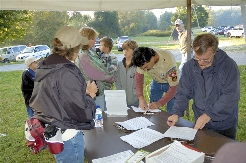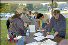 Volunteers register for National Public Lands Day 2007 at Howe Meadow. || The Adopt-a-Trail Program is an opportunity for people of all ages to assist the staff of Cuyahoga Valley National Park in maintaining safe and well-groomed trails by joining a group that takes responsibility for one trail. Volunteers help "sweep" the trail by picking up litter, trimming branches, clearing culverts, and reporting trail conditions. In 2007, over 110,000 volunteers across the country participated in the 14th annual National Public Lands Day, contributing over $12 million worth of labor in clean-up, trail repair, and planting.