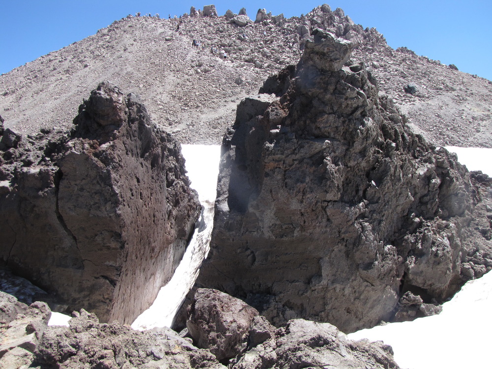Rock and lava formations on the slopes of Lassen Peak surrounded by patches of snow.