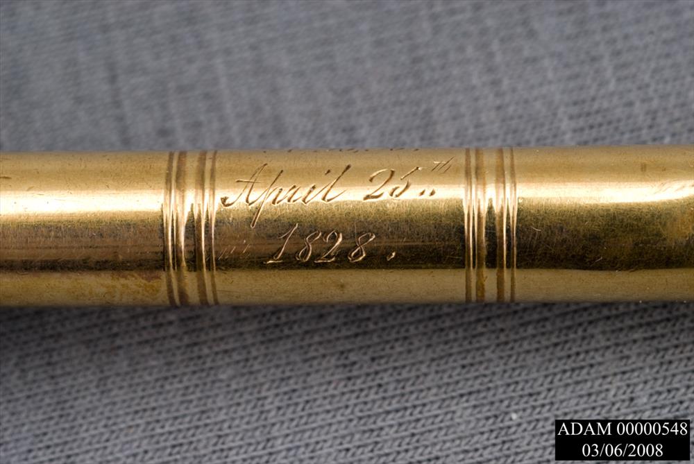 IN 542. GOLD PENCIL WITH CHASED SETTING ENCLOSING A TOPAZ SEAL WITH ENGRAVED INITIALS. INSCRIBED "ABB (ABIGAIL BROWN BROOKS) APRIL 25TH 1828." INITIALS "ABA" CUT IN THE TOP OF THE STONE FOR SEALING PURPOSES. GIVEN TO ABIGAIL BROOKS BY CHARLES FRANCIS ADAMS ON HER BIRTHDAY. CFAS DIARY: BOSTON 23RD APRIL 1828: "PURCHASED A GOLD PENCIL CASE INTENDED AS A PRESENT TO ABBY ON HER BIRTHDAY." INSCR: ABA APRIL 25TH, 1828'