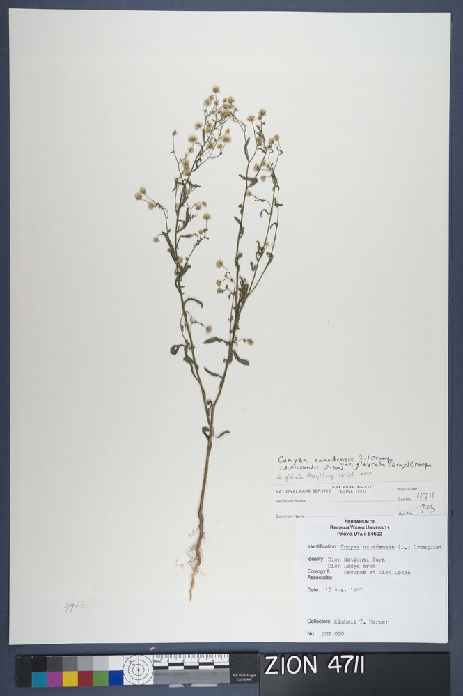 Conyza canadensis var. glabrata, Horseweed. Collected by Kimball T. Harper, 08-13-1987. Catalogued by Margaret Malm, 1988.