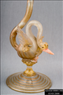 VASE. VASE - BLOWN; COLORLESS GLASS WITH SPIRAL GOLDSTONE STRIPING; LONG NARROW TRUMPET FORM WITH FLARING GAUFFERED RIM; HAND-TOOLED SWAN AT BASE OF STEM WITH CURVING NECK, APPLIED WINGS AND APPLIED ORANGE BEAK AND FEET; SPOOL STEM ON RIGAREE KNOP; ROUND FOOT WITH FOLDED RIM AND GOLDSTONE SPIRAL; ROUGH PONTIL; VENETIAN, C. 1850-1900
