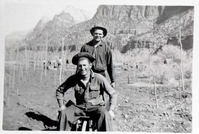 Two Civilian Conservation Corps (CCC) men riding in wheel barrow near the South Entrance. ; ZION Museum and Archives Image 402_05_04002 ; ZION 15933