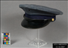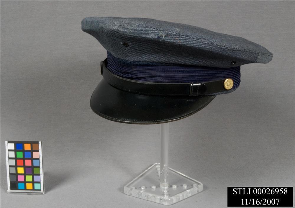 GREY CLOTH FLAT CROWN OF HAT WITH A GREY FRONT PEAK AND BLUE BRAID AROUND THE CIRCUMFERENCE OF THE HAT. BLACK LEATHER CURVED FRONT BRIM WITH A BLACK LEATHER STRIP ABOVE ON THE FRONT OF THE BLUE BRAID. THE LEATHER STRIP IS AFFIXED WITH ONE GOLD-COLORED CIRCULAR PIECE OF METAL AT EACH END. IMPRESSED ON THE METAL IS (IMMIGRATION, US, SERVICE). INSIDE THE HAT IS GOLD CLOTH W/(BROOKS...) PRINTED ON IT. A CLEAR SQUARE OF PLASTIC IS PARTIALLY SEWN AT THE CENTER WITH A PIECE OF PAPER: (BROOKS UNIFORM CO.) INSIDE. "7" IS PRINTED OM THE INSIDE OF THE HAT.