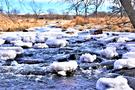 A bright, blue sky over yellow prairie grass and bare trees. A creek runs through the middle of the photo with chunks of ice strewn through it.