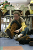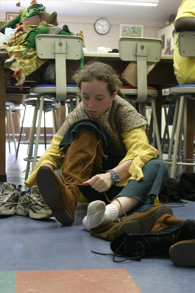 Since the mid-1990s, Cuyahoga Valley Environmental Education Center has offered a variety of summer residential camps. River Run - Theatre: "Fantasy in the Forest" is provided in partnership with Magical Theatre Company. Children entering grades 5-10 work with professional faculty to develop their performing arts skills in acting, voice, movement, and stage combat. The short performances are outdoors and integrate into the natural setting of the CVEEC campus. || Summer theatre campers get fitted for costumes.