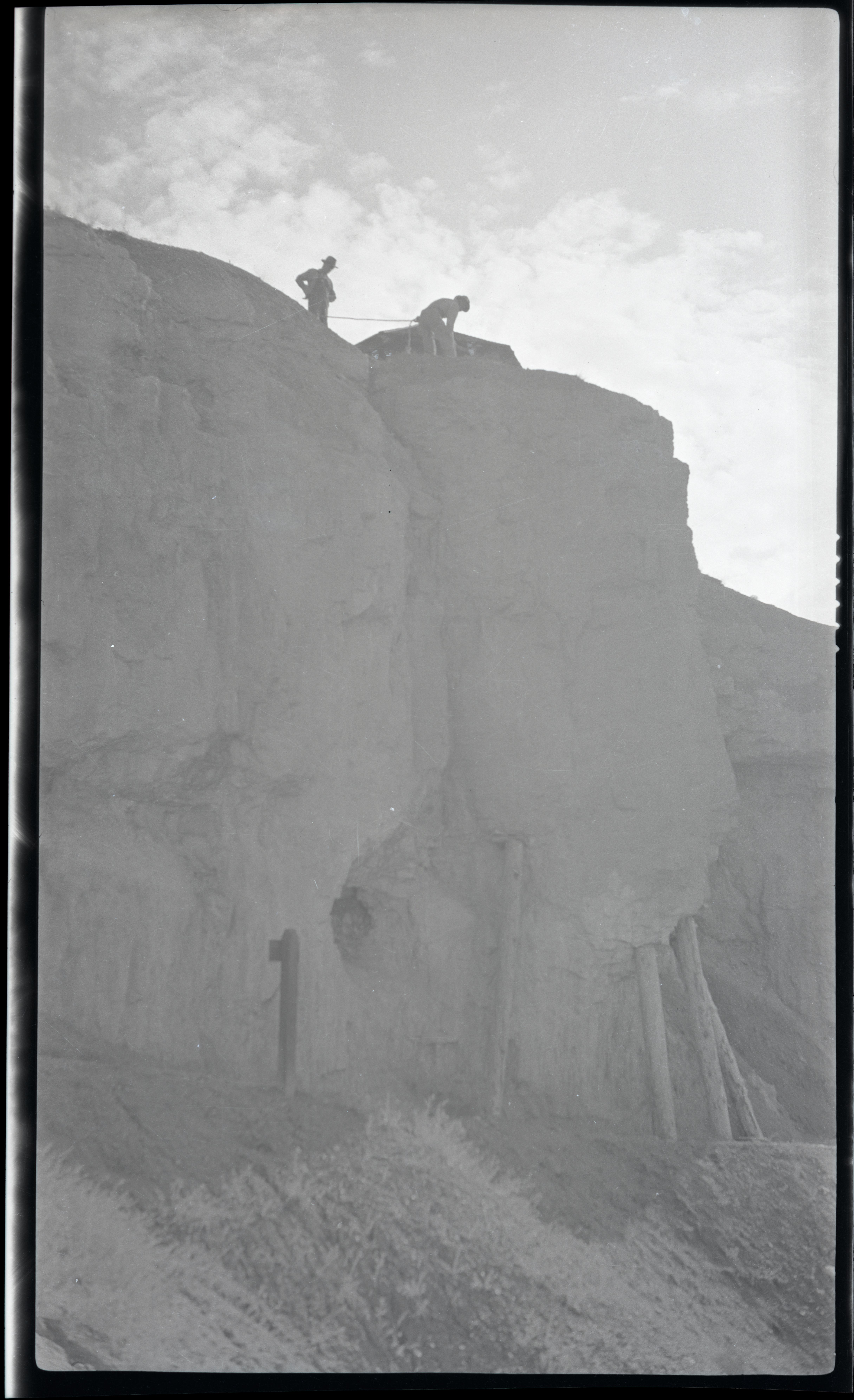Nitrate negative of Maurice Cope supervising employee using pick axe on the rim above a trail in BRCA. Large logs supporting rock from below. Structure on rim in background. ; BRCA Museum and Archives Image BRCA8875_001_570 ; BRCA 8875