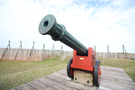 Cannon stands in front of the wood walls of Fort Caroline. The walls face the water and could be taken down to load supplies from ships.