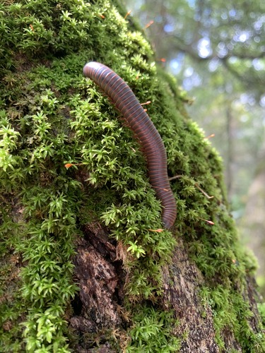 red-brown millipede on bright green moss covered tree
