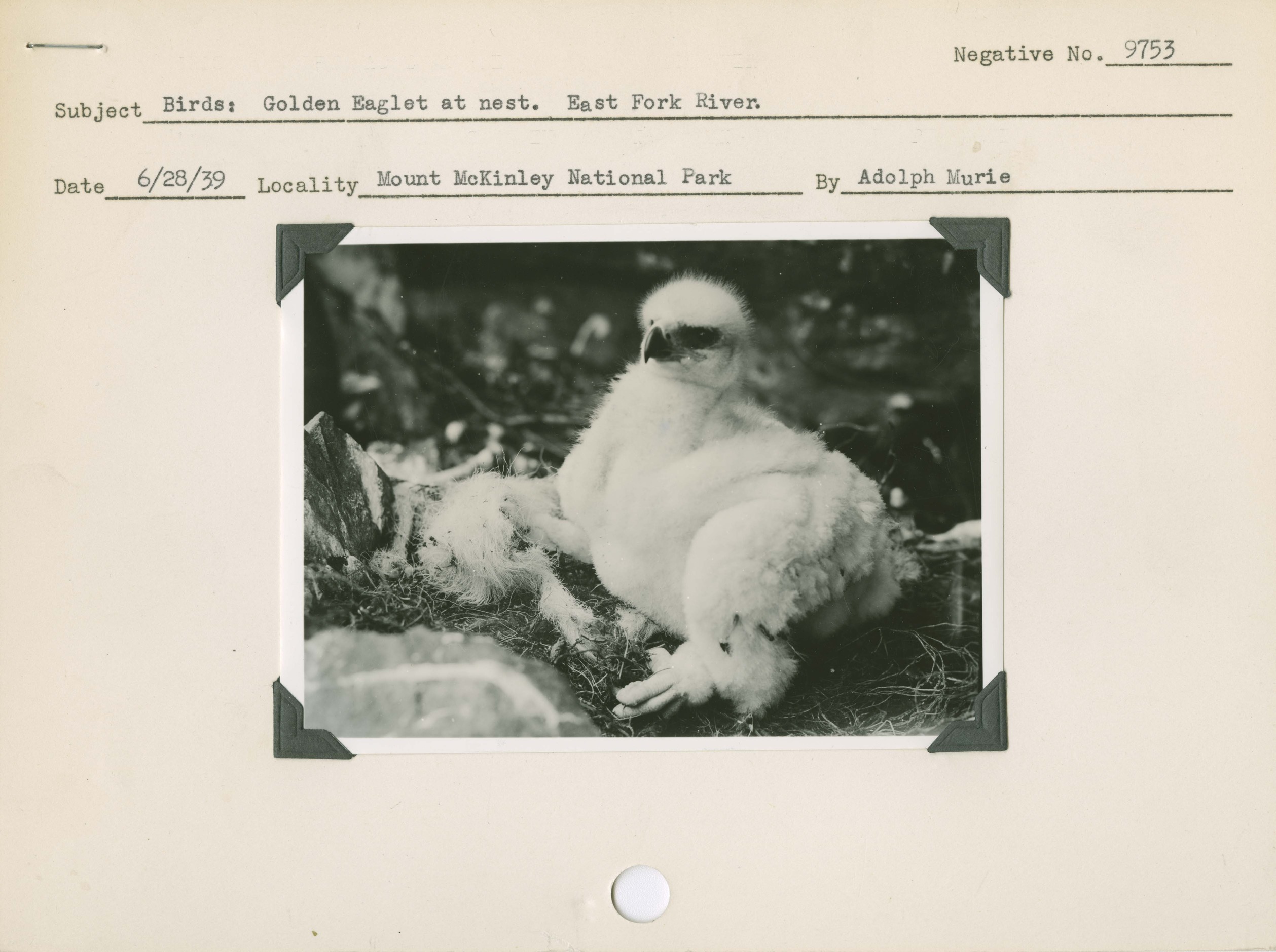 Birds: Golden Eaglet at nest. East Fork River. Locality: Mount McKinley [Denali] National Park. Negative #9753
