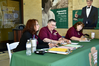 Three ladies with red shirts reading "Volunteer" sit at a table and fill out forms in front of Homestead NHP's Education Center.