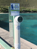A fishing line receptacle on a dock with tropical blue water in the background.