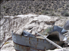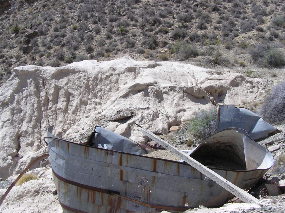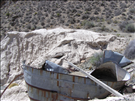 Remains of a vat that was used to process gold ore with cyanide at the Bonanza King Mine. The vat is sitting on the edge of a large tailing pile that is at the head of a wash. The pile is approximately 35 to 40 feet tall and the contaminated sediment is moving downstream.
