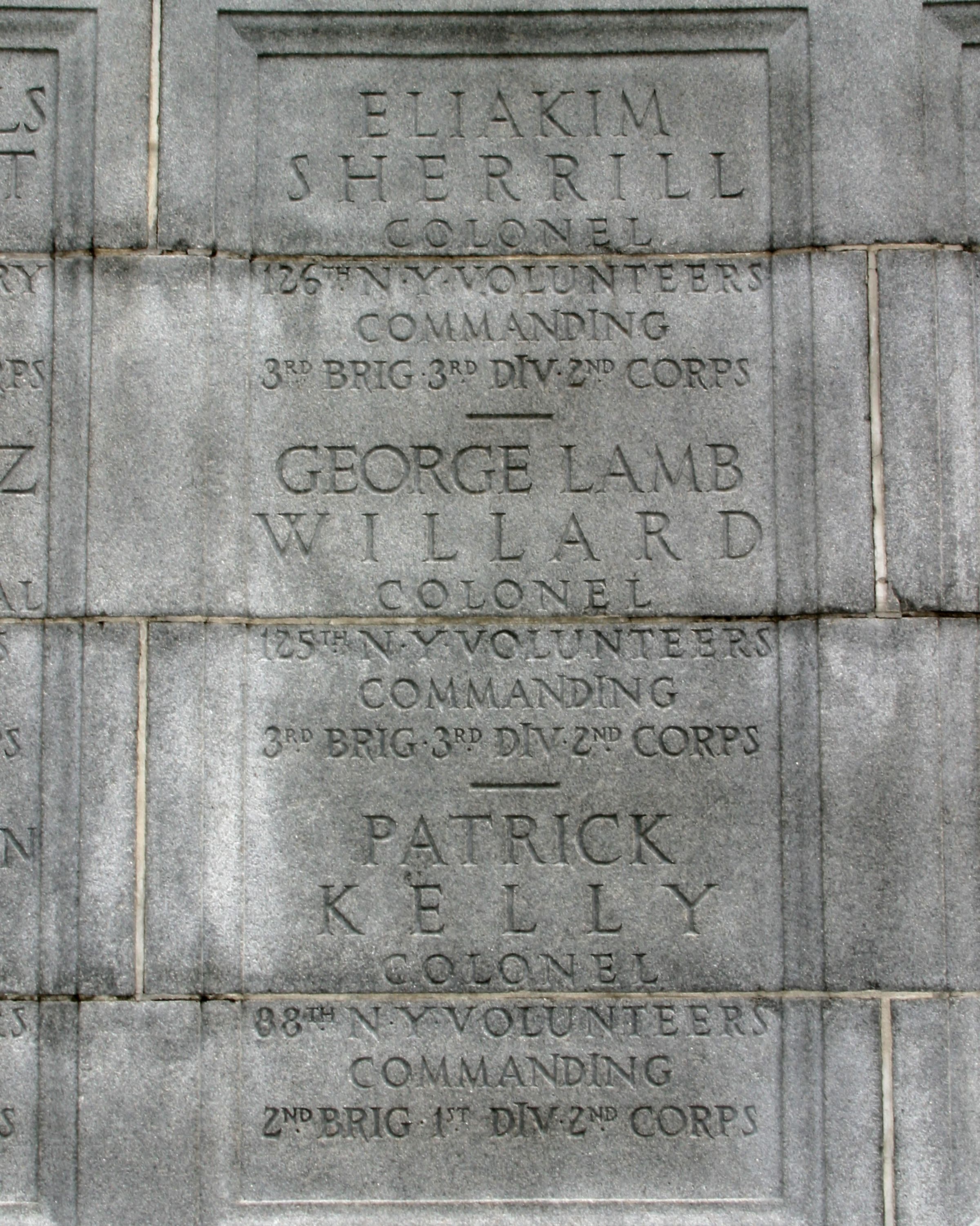 1 of 2 New York State Monuments. Erected to commerate NY commanders not listed elsewhere that fought at Gettysburg. Located E side South Hancock Avenue. || Mn, semi-circular 42'L x 24'D x 21' H. Central projecting node of base, shaft incised inscriptions, excised coat-of-arms, topped by spread wing eagle. Incised commander names in circular wall portions. Granite walk to Mn 8'x 14'w/2risers 8."