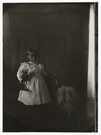 Young Amy in a white dress stands before a rocking horse and holds a statue of a horse in her right hand. A shaggy toy dog stands next to her. Notes: C1892-C1895 based on the subject's apparent age. Identified as Amy by Frances Wetherell. A modern non-archival print developed for Mrs. Arthur Brooks is in an accompanying envelope.